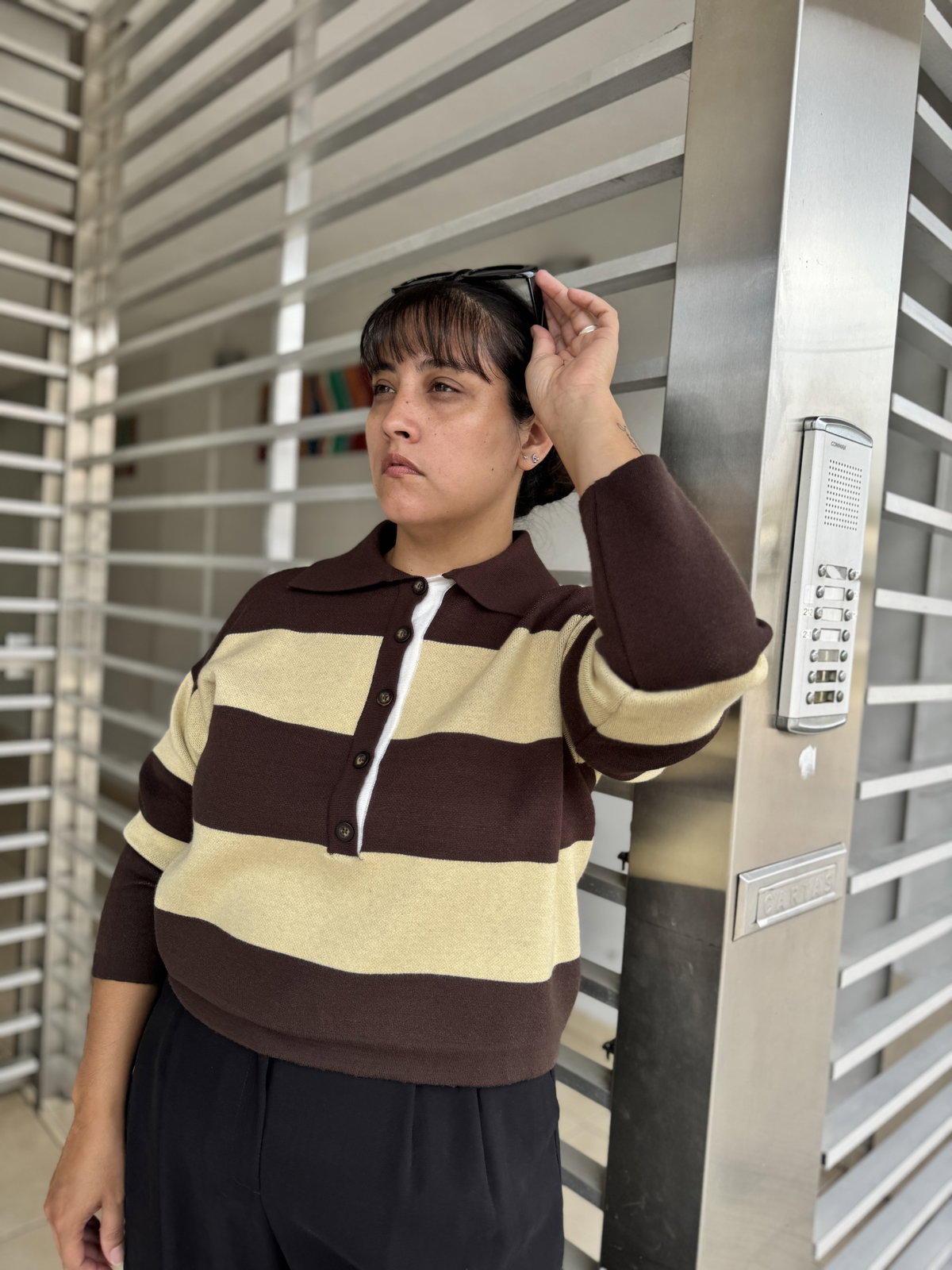 Sweater de corte relajado, con cuello tipo polo y detalle de botones.